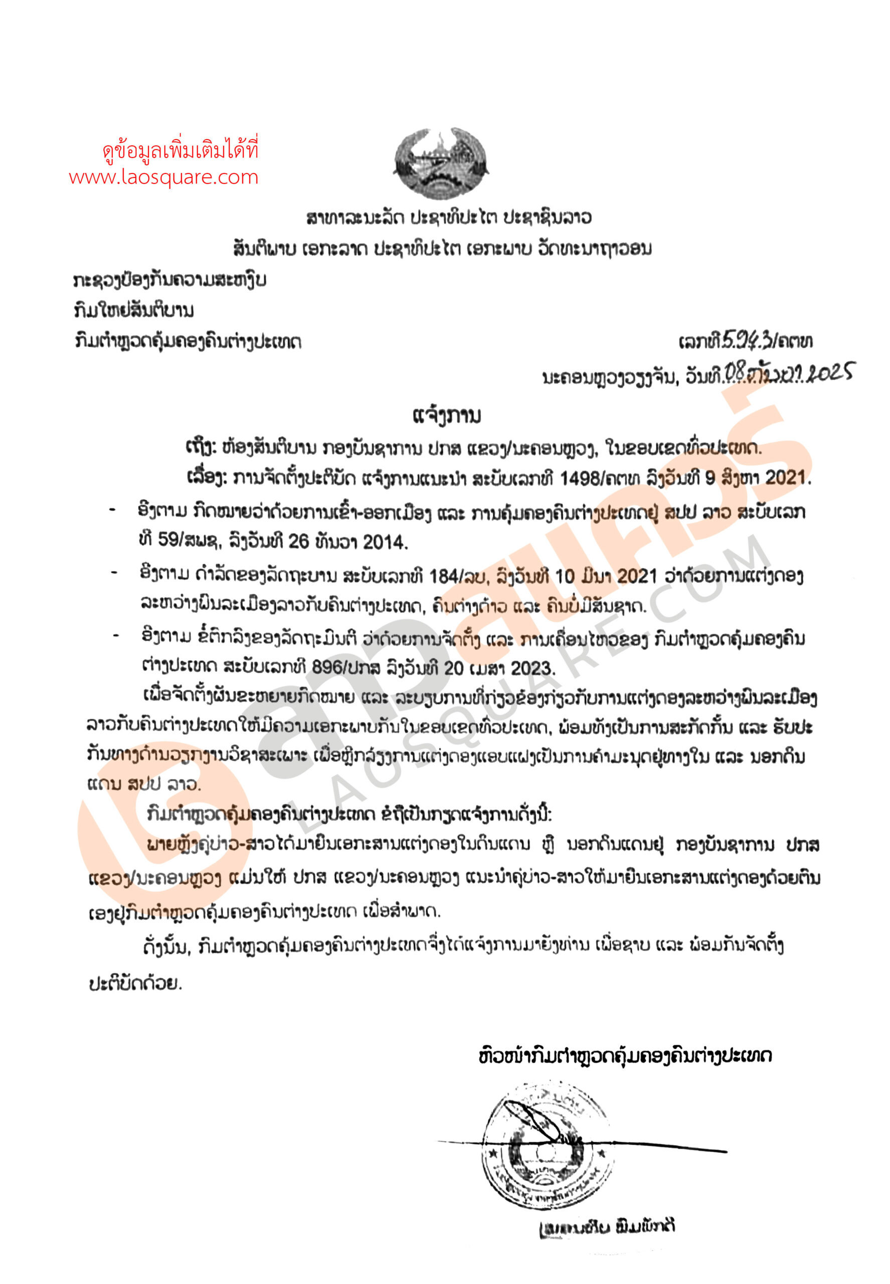 - อิงตาม กฎหมายว่าด้วยการเข้า-ออกเมือง และการคุ้มครองคนต่างประเทศอยู่ สปป. ลาว ฉบับเลขที่ 59/สพซ. ลงวันที่ 26 ธันวาคม 2014