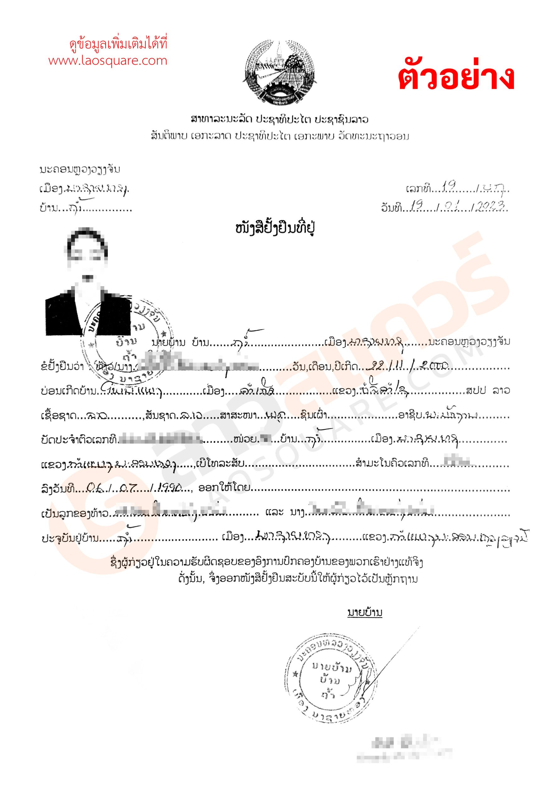 การดำเนินการเอกสารจดทะเบียนสมรสของฝ่ายคนลาวจะเริ่มต้นที่ “นายบ้าน” หรือผู้ใหญ่บ้าน ของบ้านที่ฝ่ายคนลาวมีชื่ออยู่ในทะเบียนบ้าน ความยากง่ายอยู่ที่ สายสัมพันธ์ระหว่างครอบครัวของฝ่ายคนลาวที่ขอจดทะเบียนสมรส กับฝ่ายนายบ้าน ถ้าทั้งสองฝ่าย มีความสัมพันธ์ที่ดีต่อกัน ก็มีค่าธรรมเนียมบ้างไม่มากเพราะเป็นหน้าที่ของนายบ้านอยู่แล้ว และเอกสารทั้งหมดจะต้องให้นายบ้านลงนามรับรอง ขั้นตอนทั้งหมดจะเริ่มต้นจากตรงนี้ กับเอกสารทั้งหมด 7 อย่าง ที่ได้มาจากห้องการภายในแขวง