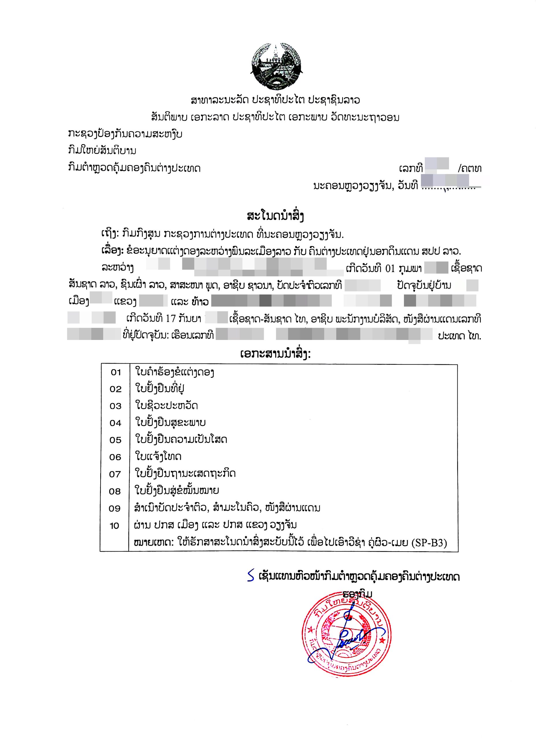 หลังจากยื่นเอกสารที่ กรมตำรวจตรวจคนเข้า-ออกเมือง (ກົມຕຳຫຼວດກວດຄົນເຂົ້າ-ອອກເມືອງ) ที่นครหลวงเวียงจันทน์ เป็นที่เรียบร้อยแล้ว และรอเอกสารอนุมัติประมาณ 2 อาทิตย์เราก็จะได้ โฉนดนำส่งเอกสาร จากกรมตำรวจตรวจคนเข้า-ออกเมือง ถึง กรมกงสุล กระทรวงการต่างประเทศ สปป. ลาว ที่นครหลวงเวียงจันทน์มาเพิ่มอีก 1 ฉบับ
